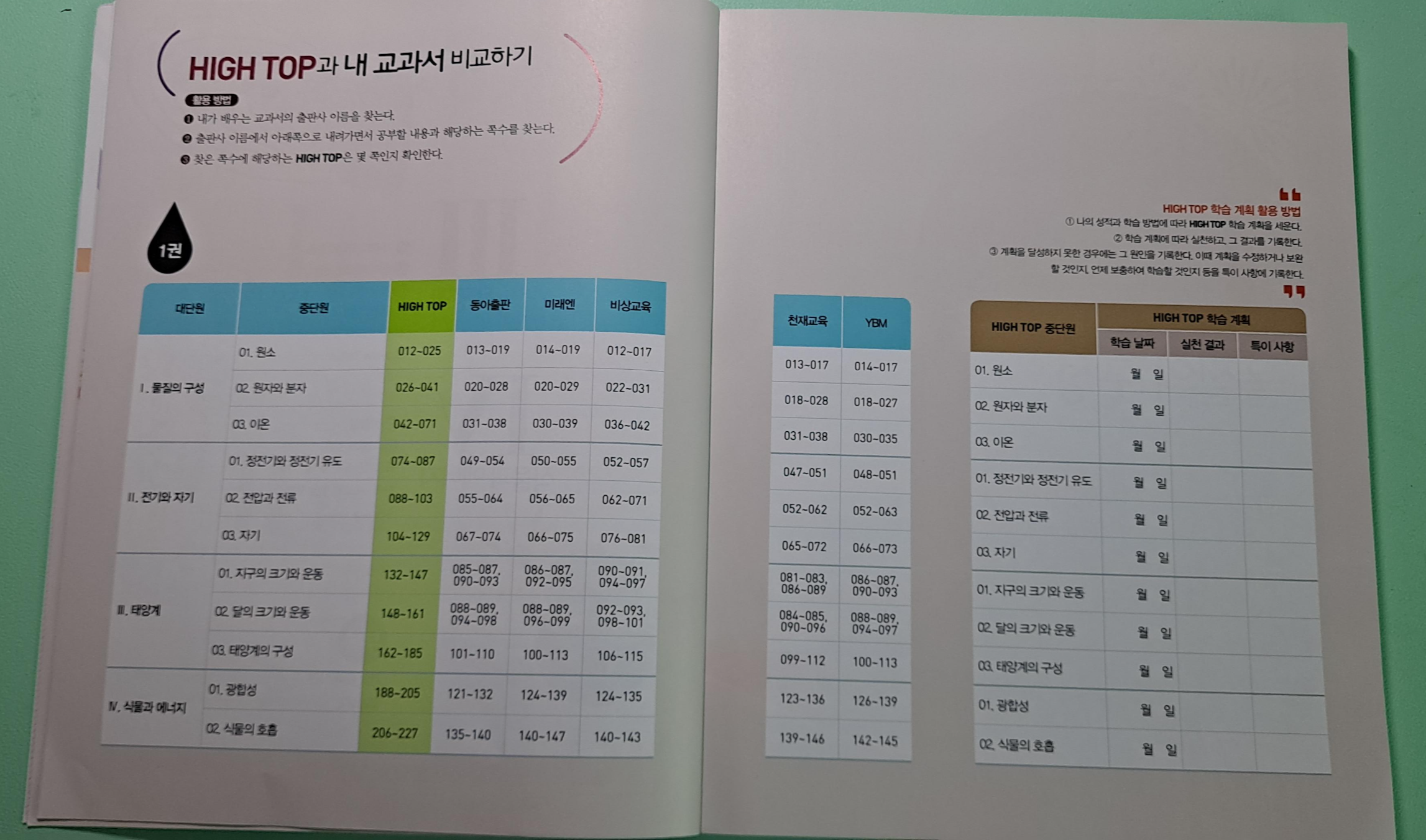 학교마다 교과서가 다르다 보니 내용 순서가 다르다. 그래서 하이탑에 교과서별 페이지가 잘 수록되어 있다. 이 표를 참조하여 진도를 봐도 되겠다.